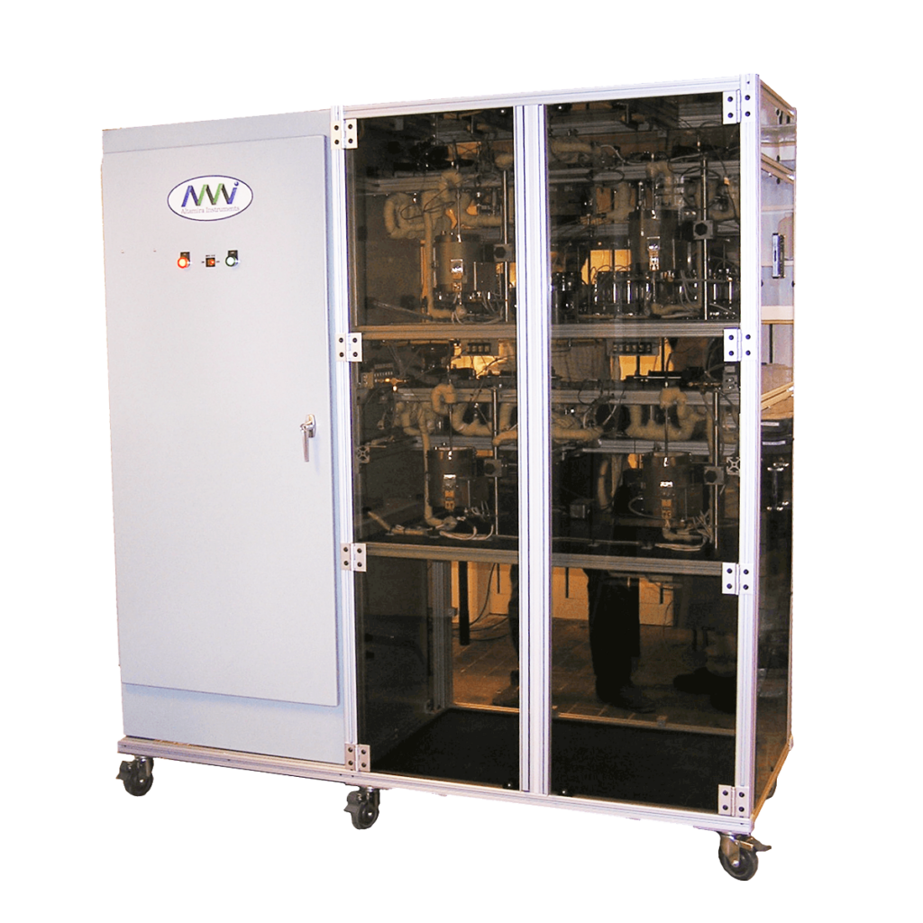 This unit consists of 4 parallel reactors with independent gas and liquid feeds. Each reactor features four gas feeds and 1 liquid feed with vaporizer. The reactor tubes can hold up to one gram of catalyst and are stainless steel with operating temperatures and pressures up to 650°C and 100 atmospheres, respectively. All reactor effluents are routed through heated lines to a heated multiposition valve for sequential sampling into a mass spectrometer. Lexan covers are provided for added safety.